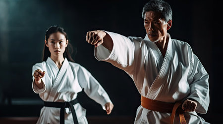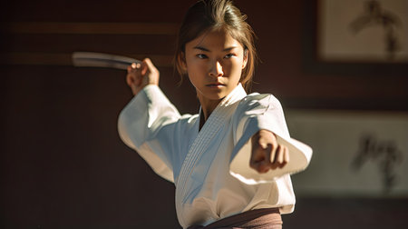 Karate practitioner performs perfect kata in Dojo., generative AI