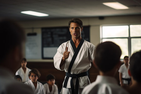 a karate coach shows students techniques. The concept of self-defense. generative ai.