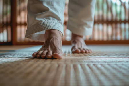 Barefoot Martial Artist on Dojo Mat Symbolizing Grounding and Balance in Sparring Preparation