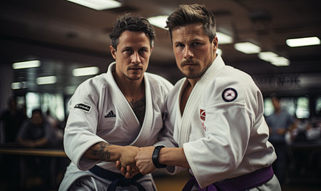 Two judo fighters in kimono fighting at the sports hall with AI generated.