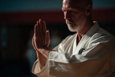 A skilled martial artist with a gray beard stands in a dojo, hands clasped in a gesture of respect. The warm light illuminates his concentrated expression as he prepares for training.