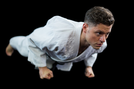 Karate player doing push-up against black background