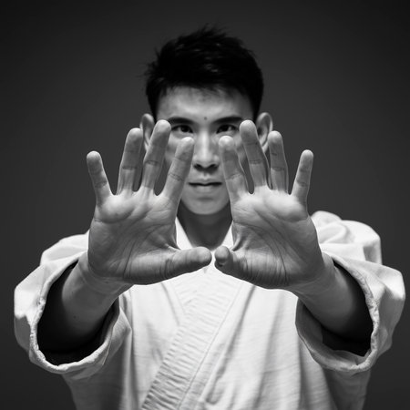 Portrait of a young Asian man in kimono practicing martial arts