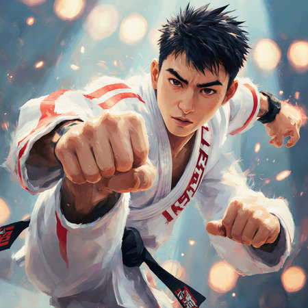 A determined figure stands poised, dressed in white gi with a black belt displaying power and focus.