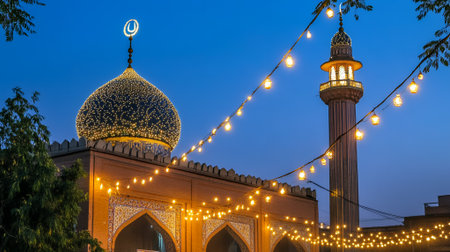 Beautiful Illuminated Mosque Night Scene Festive Lights Ramadan Eid Sky Dome Blue Holy Star Islam