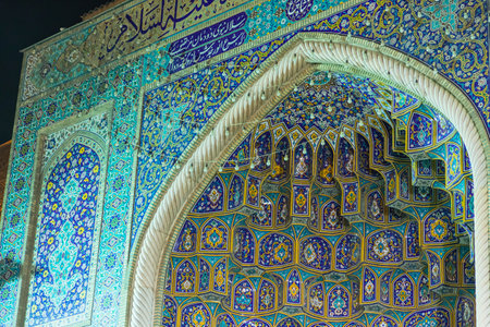 Shiraz, Iran - 29 October, 2018: Wonderful details of Persian exterior of the Shah Cheragh Mosque and Mausoleum. Walls decorated with colorful mosaic. Gorgeous chandeliers. Islamic architecture.