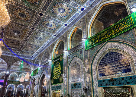 Karblaa, Iraq - 10,Mar 2022: internal picture for imam hussien holy shrine in Karblaa city in Iraq , and showing oIslamic decor embroidered with gold and beautiful inscriptions