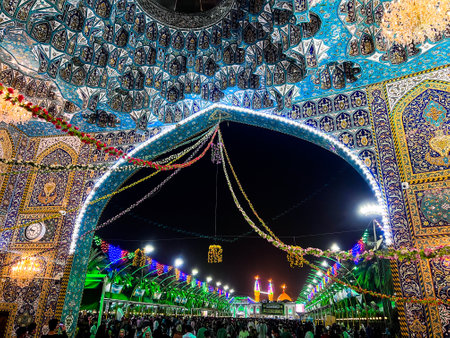 Karblaa, Iraq - 10,Mar 2022: internal picture for imam Abaas holy shrine in Karblaa city in Iraq , and showing oIslamic decor embroidered with gold and beautiful inscriptions
