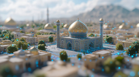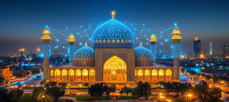 Glowing Mosque with Minarets in Futuristic Cityscape at Night, Digital Network Connection