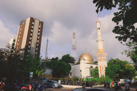 Male, Maldives - June 25, 2021: Cityscape View to the White and Golden Minaret and Dome of the largest Grand Friday Mosque in Maldives