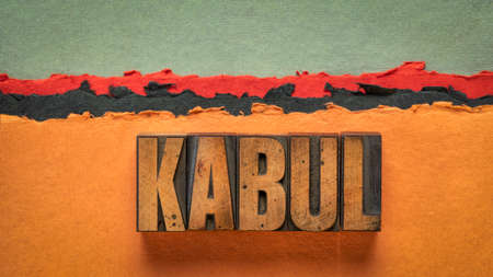 Kabul word abstract in vintage letterpress wood type printing blocks against abstract paper desert landscape in red, orange and black tones