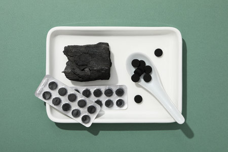 Selective focus on powders of activated charcoal on stainless steel drug tray and blur capsule background