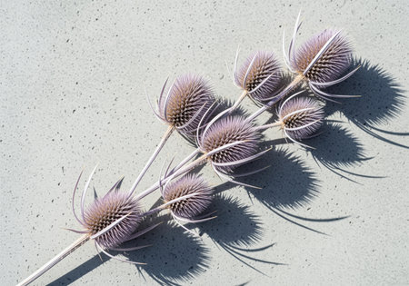 Dried sprig of pale lavender thistle heads arranged linearly on a speckled gray concrete surface. strong sunlight creates long, sharp shadows, emphasizing texture and minimalist design.