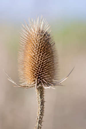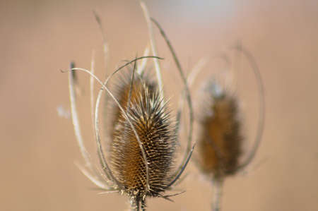 Close up of dry thistle flowerhead. Dipsacus sativus, wild teasel dried head in nature,selective focus, beige bokeh background