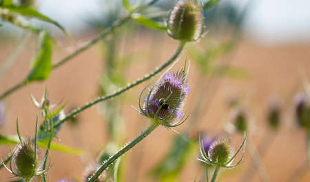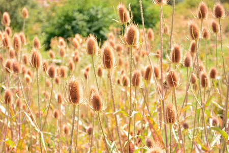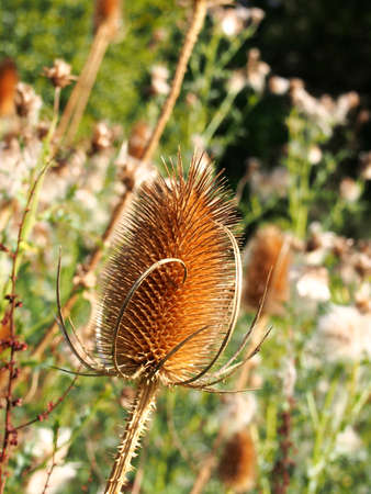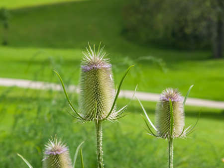 Beautiful garden flowers. Teasel plant in sunlight.