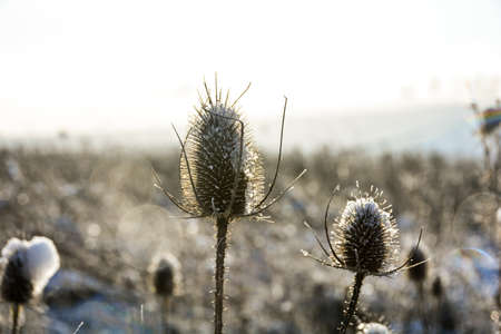Wild teasel on a field in winter with snow, at sunrise