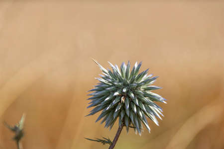 Blue southern globe thistle, Echinops flower close-up on a blurred background of yellow dry grass