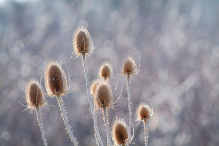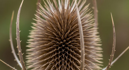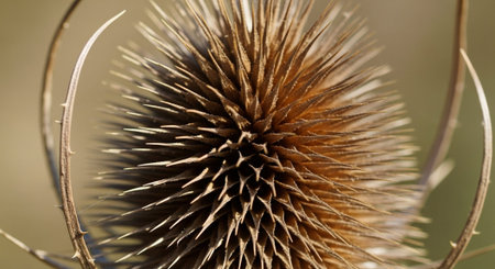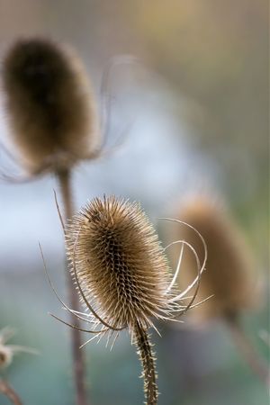 Wild teasel brown seed close-up view with blurred background