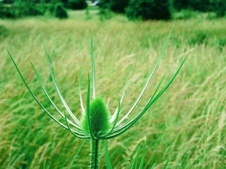 Thistle (Dipsacus fullonum) in bloom in green grass meadow.