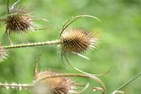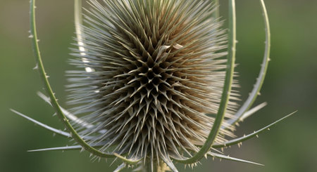 Wild teasel seeds close-up view with green blurred background