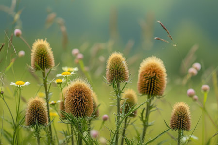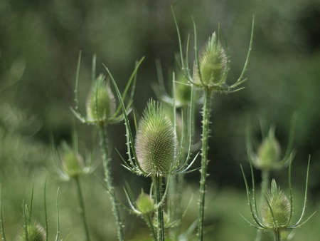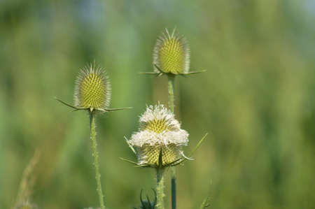Teasels with flowers against a green background