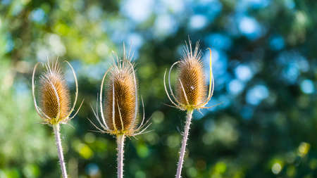 Dry teasel flower heads detail on green leaves background. Dipsacus. Thorny faded thistles in idyllic nature. Wild curative herb in alternative and herbal medicine. Bokeh on blue sky. Selective focus.