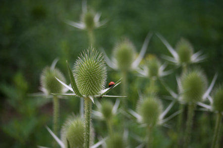A selective focus shot of a bug on a wild teasel