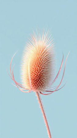 A close-up shot of a dried teasel flower, showcasing its intricate texture and form, set against a soft, light blue backdrop.
