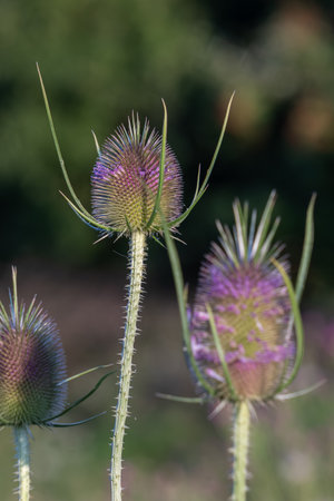 Several Wild Teasel plants Dipsacus fullonum stand tall. The seed heads display purple flowers emerging from their spiky green structures. Light filters through the plants.