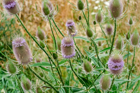 Carding thistles, dipsacus fullonum, in the field in late summer
