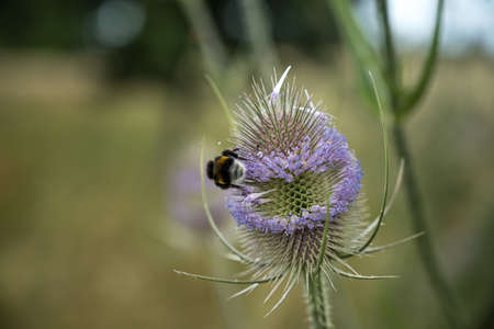 Fuller's teasel or Dipsacus sativas blossom at flowerbed close-up, selective focus, shallow DOF.