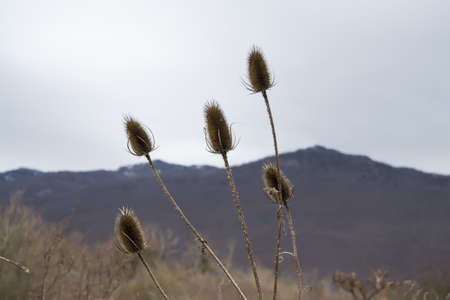 Three dried thistle thistles (Dipsacus fullonum) in cereal field and mountain in the background.