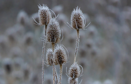 A closeup shot of frozen Teasel, Dipsacus