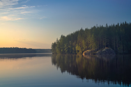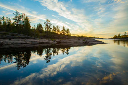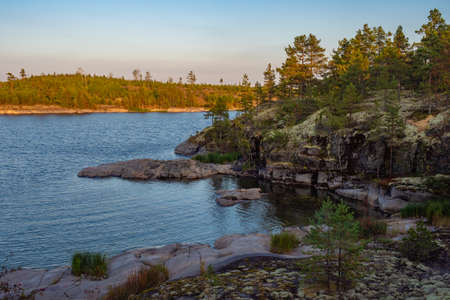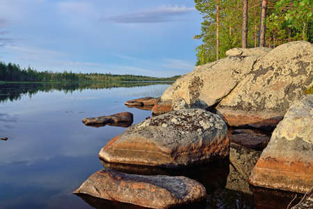 Sunrise on a rocky shore. Still water. Pine forest in the background. Northern landscape