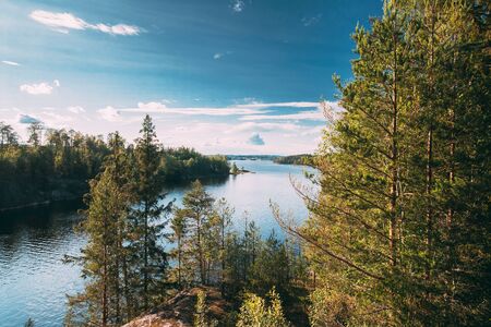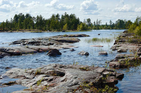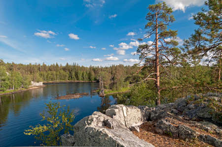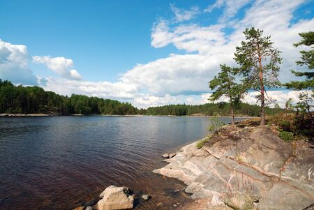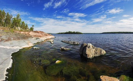 Landscape of blue lake deep in the light of the sun in the daytime, clouds in the sky Ladoga skerries Karelia