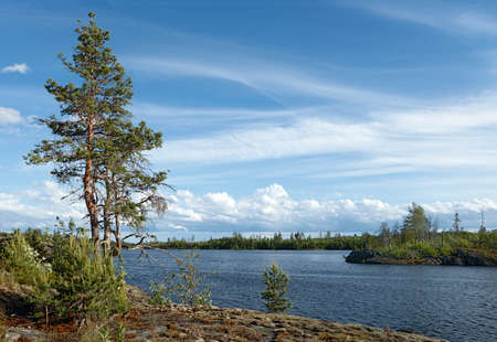 Karelian landscape - rocks, pine trees, sky and water. Lake Pongoma, Northern Karelia, Russia