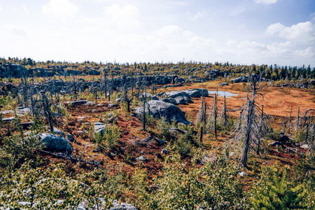 Forest with dead spruce and deciduous trees on top of Mount Vottovaara in Karelia, Russia