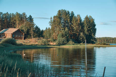 Summer cottage or log cabin by the blue lake in rural Finland. Idyllic countryside landscape view with blue water and green forest.