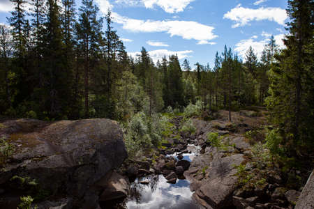 A typical Norwegian landscape with a river, mountains and forest behind. Summer lanscape with river behind the mountains in Norway.