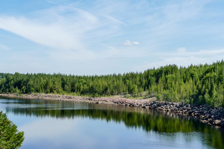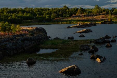 Lake with rocky shores. Large forest lake. The sky and trees are reflected in the water. The reflection in the water. Nature. A peaceful landscape. Sunset.