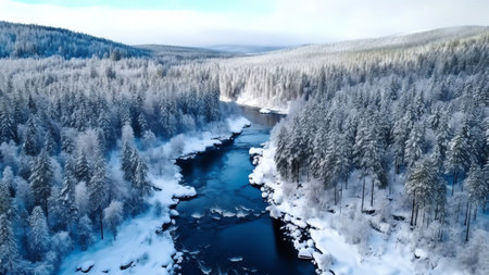 Generative AI : Aerial view of a winter road near Ruka Region of Lapland Finland