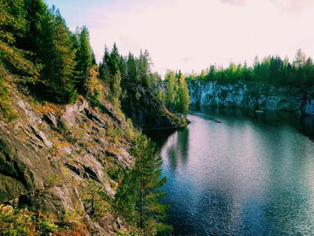 Landscape of blue lake deep in the light of the sun in the daytime, clouds in the sky Ruskeala Karelia Russia