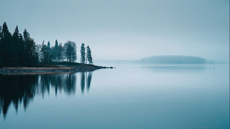 This serene landscape captures a calm lake reflecting a misty sky and surrounding trees, evoking a sense of tranquility and natural beauty in early morning light.