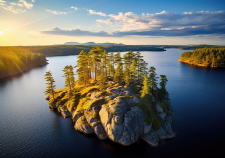 Sunrise in the wild. Dawn. Nature of Karelia. Pine on the shore of Lake Ladoga. Travel to Russia. Republic of Karelia. Islands. Northern nature. The sun above the water.