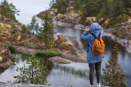 Tourism. Hiking. Ladoga skerries on Lake Ladoga. A female tourist in a raincoat with a backpack on the rocky islands looks into the distance. Republic of Karelia, Russia.
