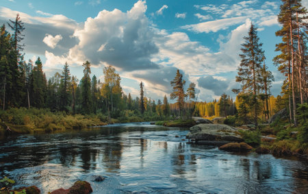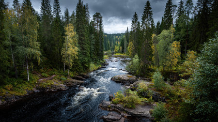 A river carves through a verdant forest, showcasing a dynamic interplay of light and shadow. The scene highlights a diverse range of evergreen and deciduous trees. This image evokes a sense of tranquility. Suitable for editorial and commercial applications such as environmental themes.