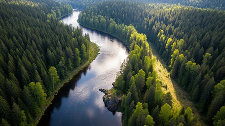 An elevated aerial perspective reveals a serene, winding river flowing through a dense, evergreen forest. Sunlight filters through the thick canopy, creating dappled patterns of light and shadow on the water and the surrounding trees. The deep green of the coniferous trees creates a lush and tranquil atmosphere. The scene conveys a sense of untouched wilderness and the peaceful beauty of a natural, undisturbed landscape.