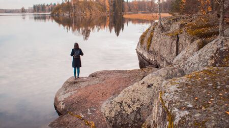 A woman stands on the shore of the lake alone. Thoughtfulness and meditation. Northern nature, unity with nature