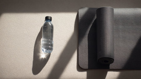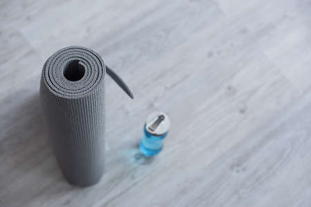selective of rolled fitness mat near sports bottle with water