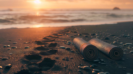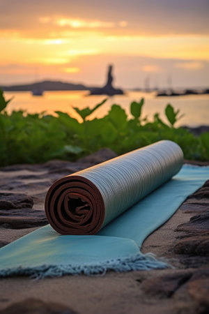 yoga mat rolled up with a peaceful beach background, created with generative ai